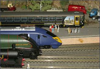 Over forty trains travel through a varied and highly detailed landscapes featuring operating lights, sounds and action, with cameo scenes from everyday life in the town and country landscape as town, countryside, seaside and even an Alpine feature. The scenery even includes more local features such as the china clay hills, a Cornish tin mine and even the fabled Beast of Bodmin lurking in the shadows. In the Alpine scene, there are skiers, chair lifts, cable cars and even mountain railway trains, operating as visitors watch. There are lots of tiny details such as a kingfisher perched on a 'No Fishing' sign. Elsewhere there are lots of other things happening: a wedding is taking place; cyclists are racing; people are losing themselves in a maze. When night time comes to the layout, the brightly lit fairground swings into action.