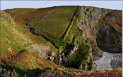The waterfall can be viewed from a few vantage points, either Pentargon cliff or the route to Beeny on the other side. A seasonal fall, depending on rainfall. On a windy day the fall can be blown into an uprising spray.